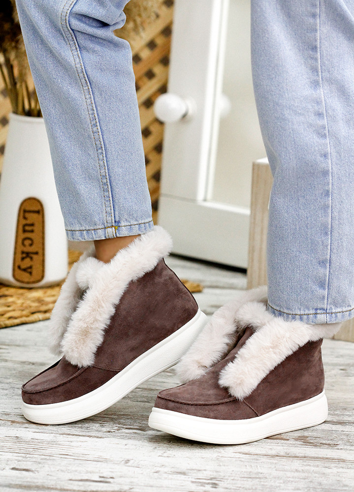Напівчеревики хутряні замша кава 7815-28 Верх: натуральна замша. Внутрішній матеріал на вибір: напівхутро (60% овчина + 40% штучна основа), або мутон. Окантовка — набивне хутро кролика. Повнота: середня. Стильна пара доповнить Ваш повсякденний образ. Модель без блискавки, обхват регулюється резинкою. Підошва ТЕП (термоеластопласт). Розмірний ряд від 36-41 розміри. Офіційна гарантія відправляється в коробці з взуттям.